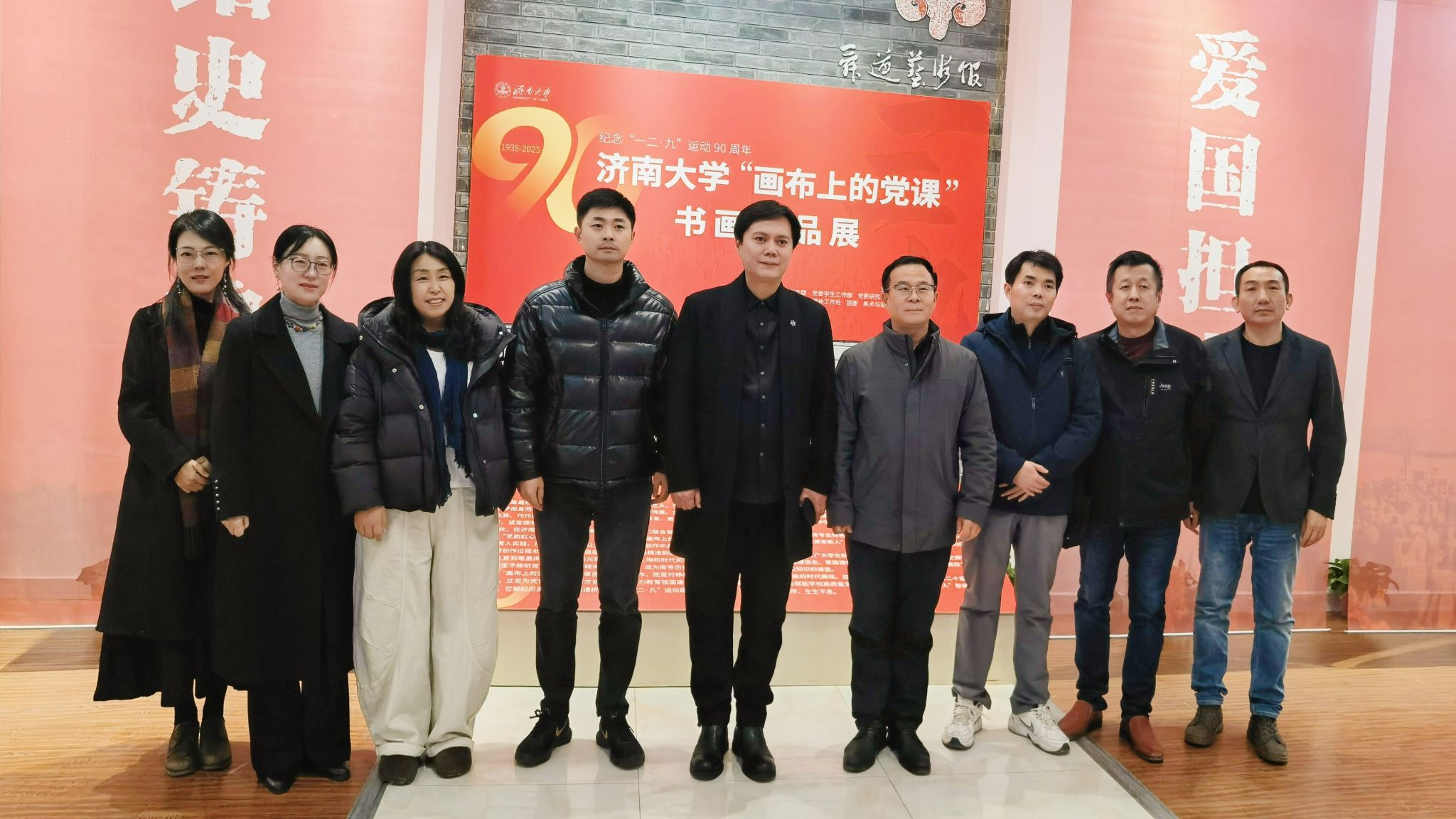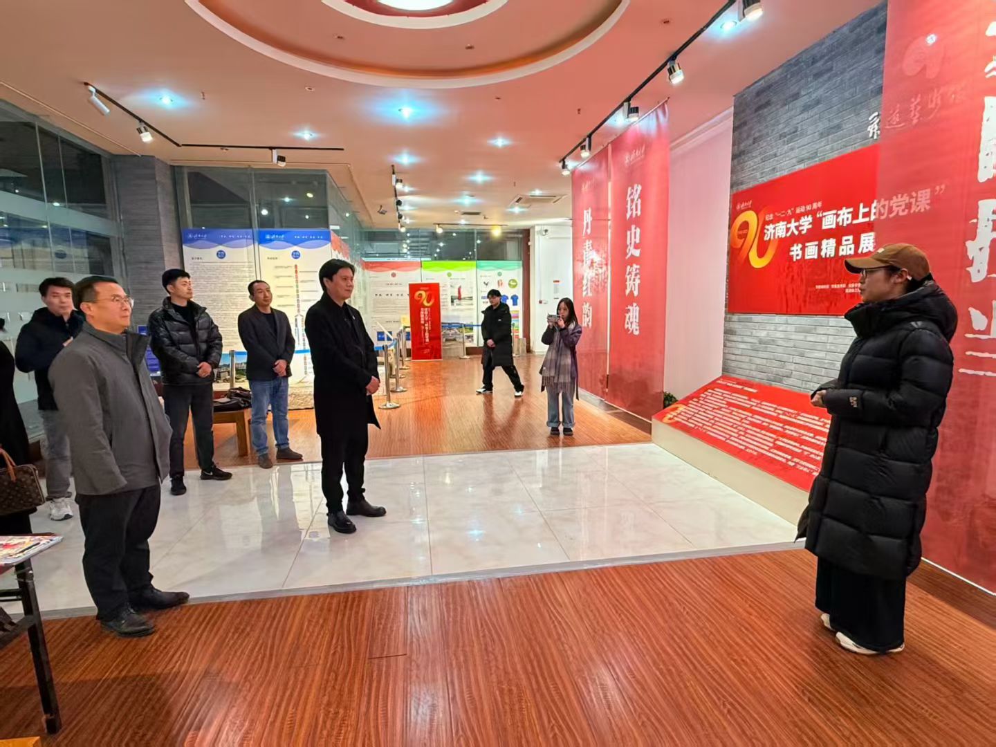 讲座结束后,骨干教师代表与张焱围绕设计学科人才培养、专业课程体系建设、跨学科育人平台搭建等核心议题进行了深入交流和探讨,为后续深化校际合作、推动学科协同发展奠定了良好基础。并一同参观了beat365官方网站“画布上的党课”书画精品展。张焱对作品的艺术创作表达与思政融合方式,红色美育有机嵌入专业基础课程、以红色文化涵养设计人才家国情怀等方面提出了专业的建议。