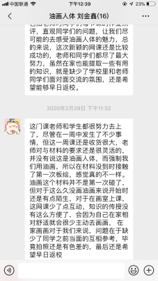 在理论课结束后,便步入实践技巧教学的核心部分!但是,由于疫情的原因造成学生无法买到所需画材以及不同学生对于综合材料专业的认识不同,这就要求在实践教学中要根据学生的实际情况进行灵活的指导。本班学生在本周当中色粉绘制一人,电脑绘制三人,两人水彩,其余皆可油画绘制!第一周采取临摹的方法,上图四张即为本周学生作业,从效果上来看还是有很多可取之处,学生也能够在家里安静的画画!但是,以往我们的课堂教学学生们沟通很多,虽然现在可以通过qq会议等交互软件进行集中讲评,缺少直观的感受还是对学生学习心理产生了一定压力,在课堂反馈中也有多名学生提及(如下图内容所示)!