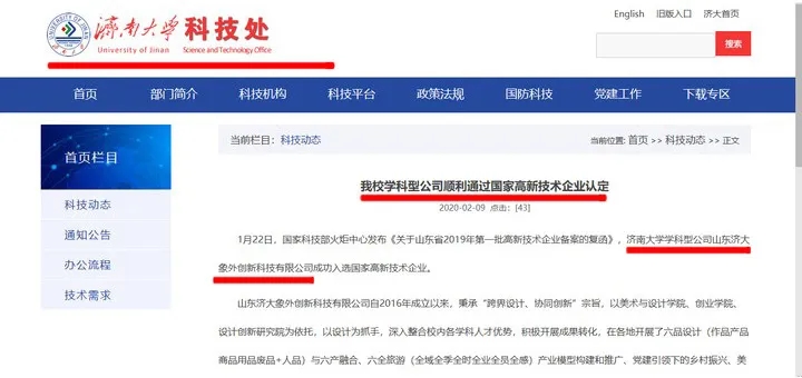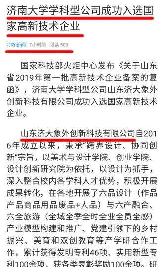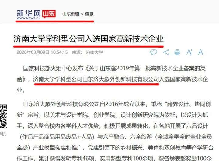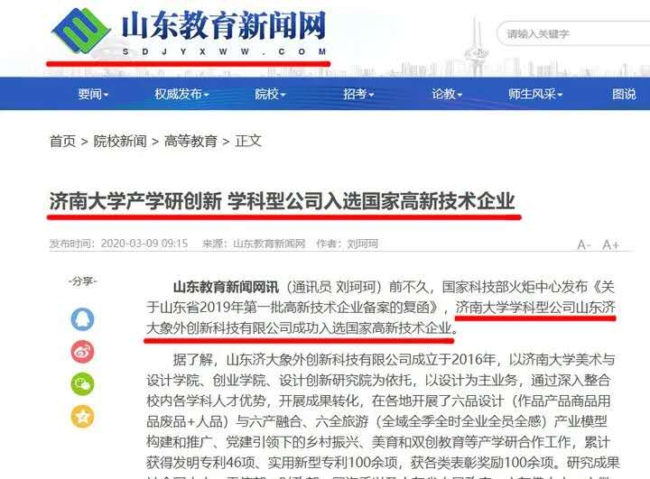 新华网、新浪网、齐鲁壹点、叮咚FM等多家媒体报道:学科型公司山东济大象外创新科技有限公司顺利通过国家高新技术企业认定。这家专门做设计的企业是beat365官方网站的一个科研成果转化平台,2016年刚刚成立,很多设计力量其实就是beat365官方网站beat365官方网站的师生。