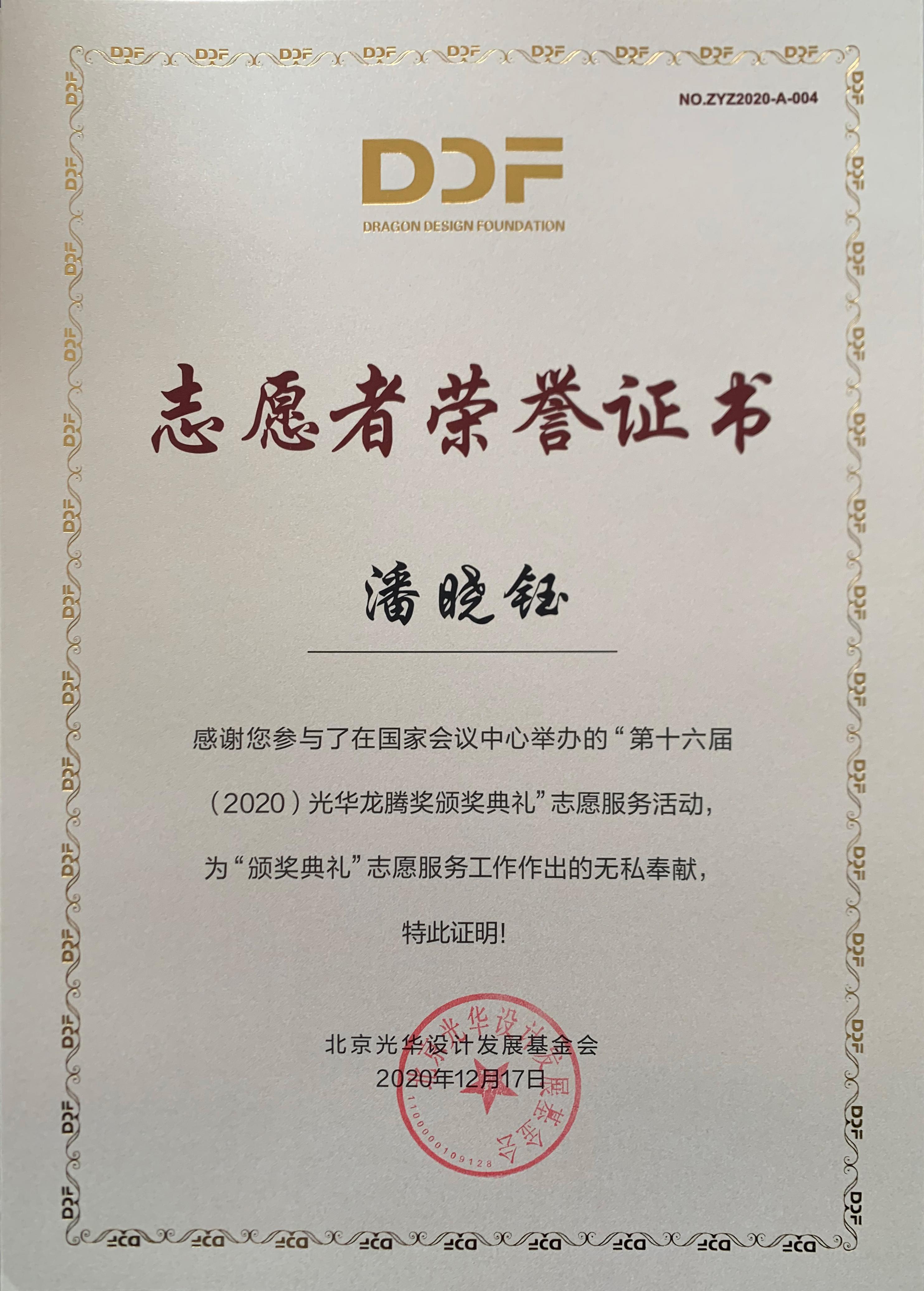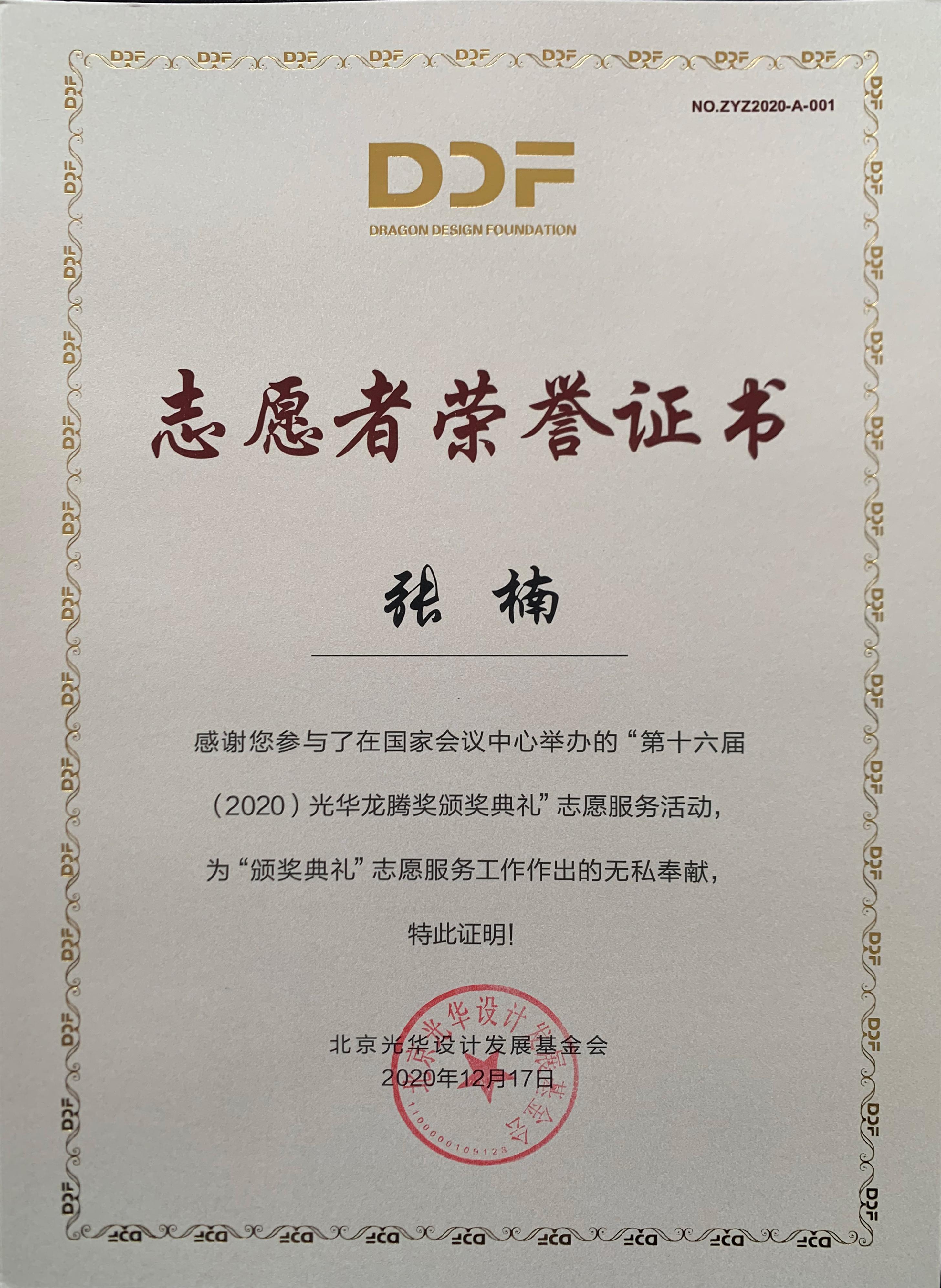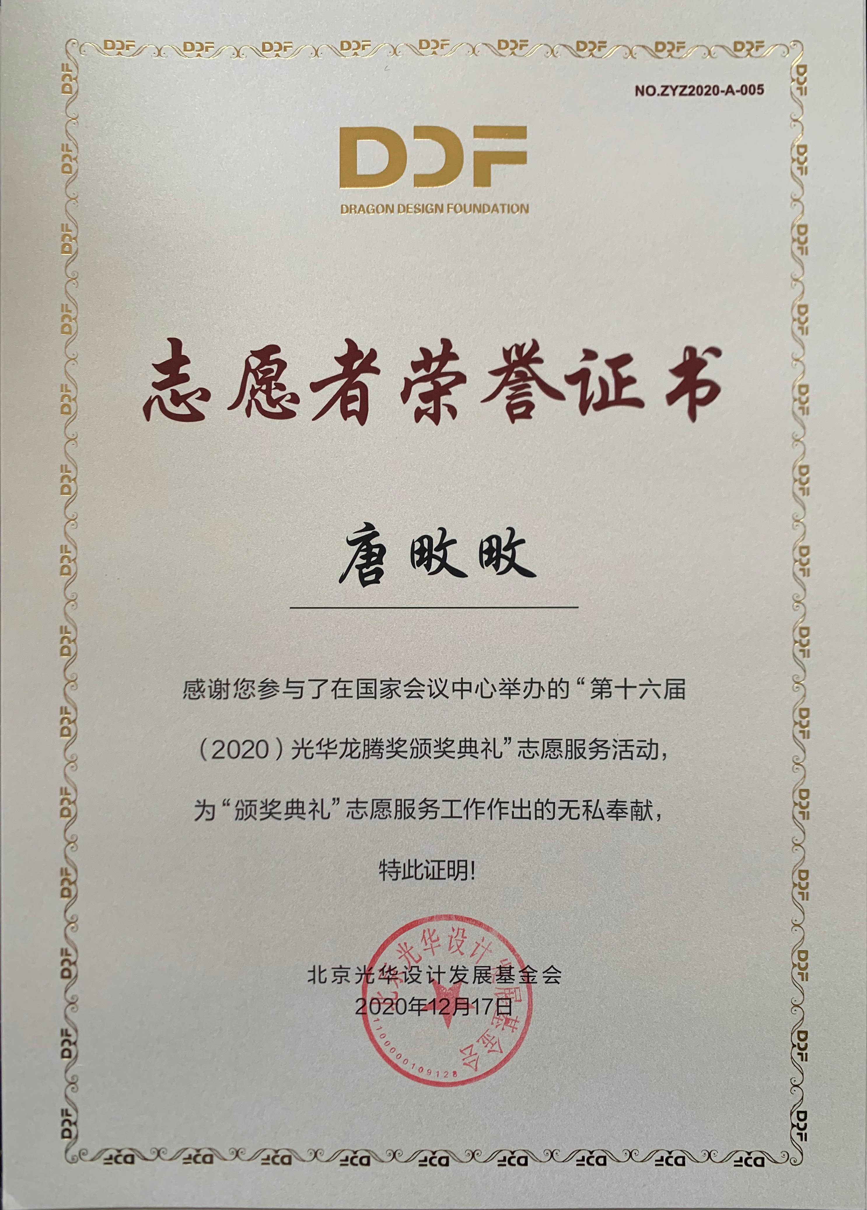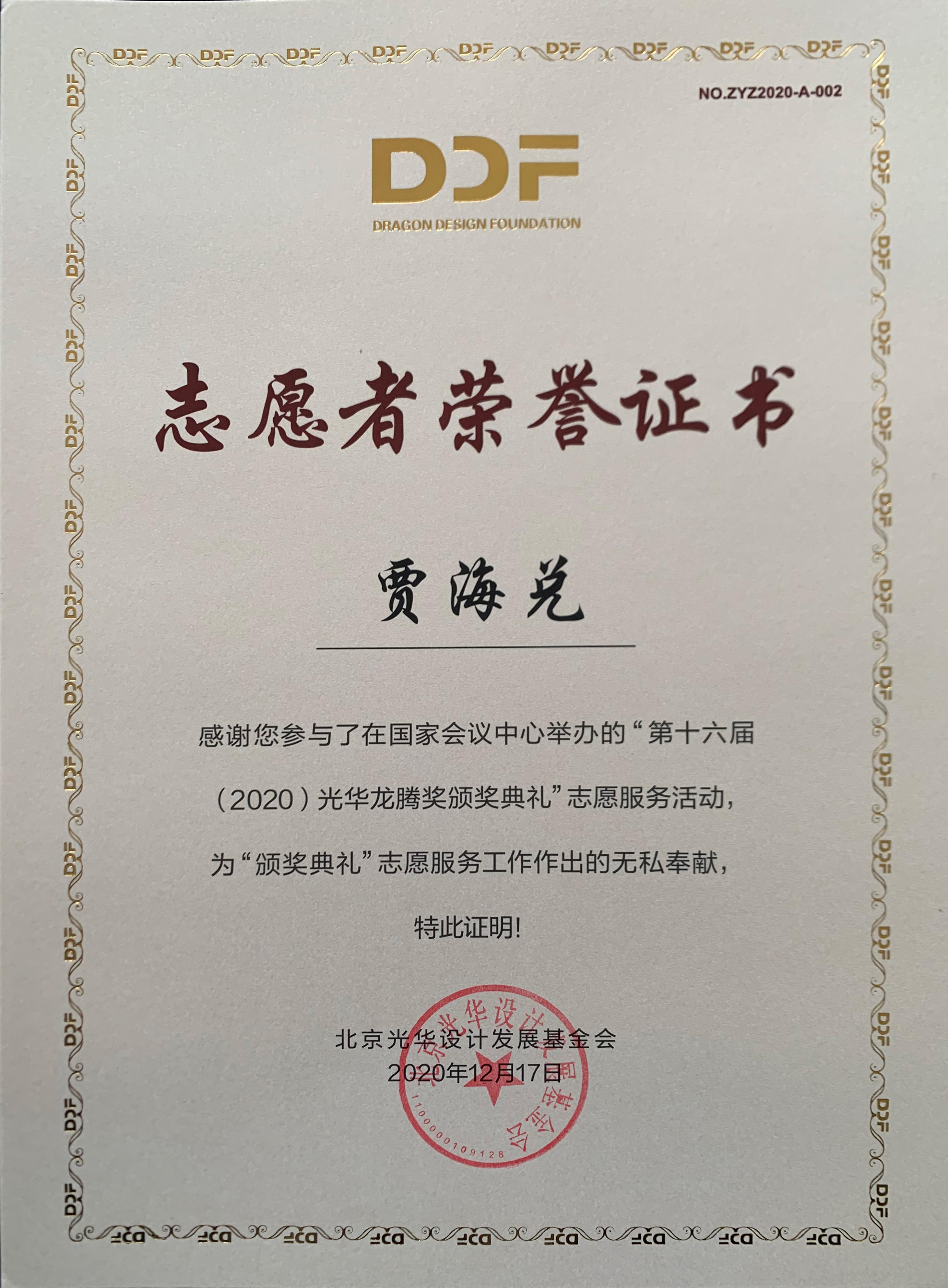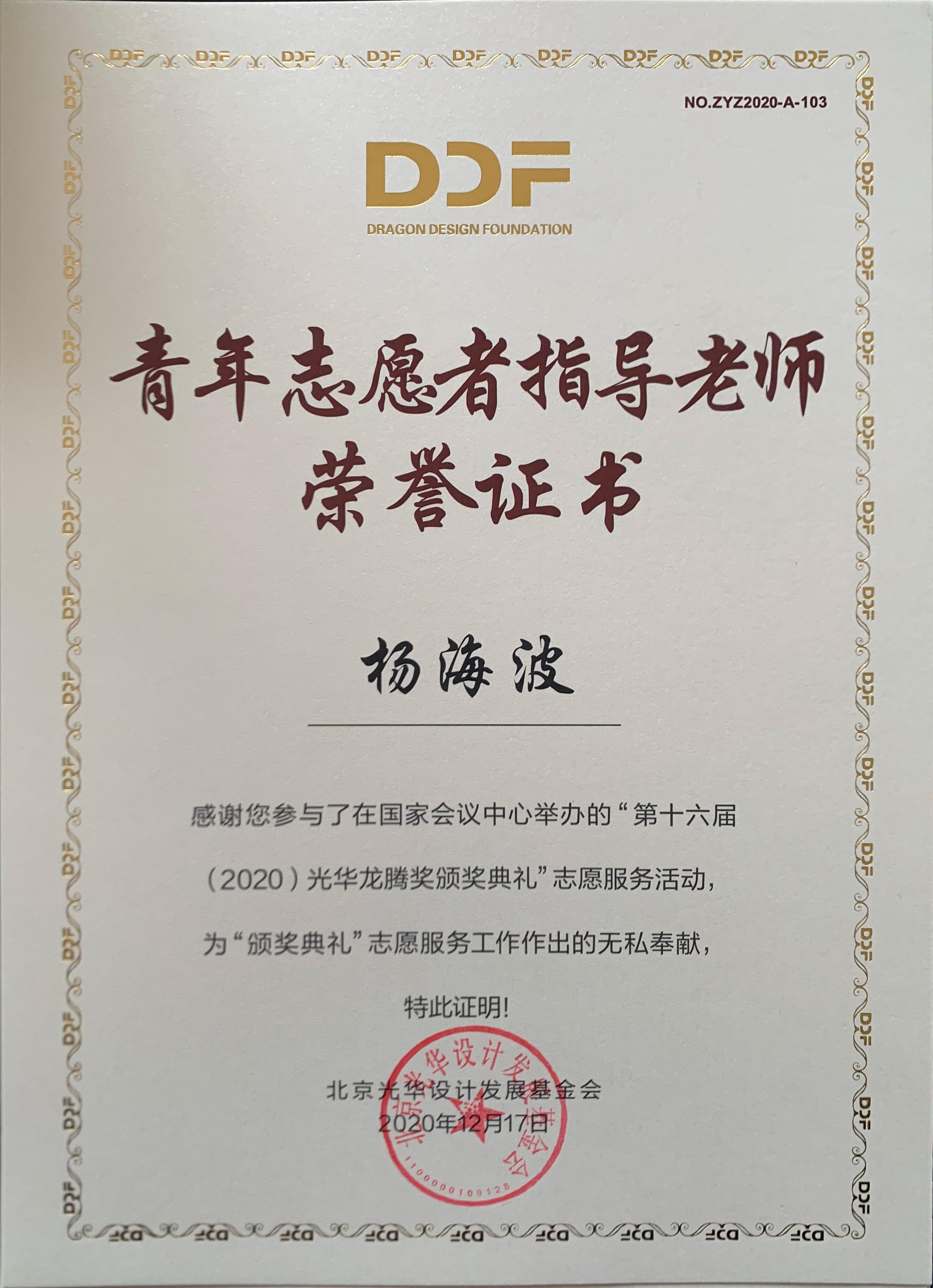 2020年12月17日上午,第十六届(2020)光华龙腾奖颁奖典礼在国家会议中心隆重举行。beat365官方网站beat365官方网站荣誉院长柳冠中被授予“光华龙腾奖委员会荣誉主席”称号。beat365官方网站杨海波老师指导的“光华-beat365官方网站志愿服务队”为北京光华设计发展基金会相关活动作了大量设计志愿服务工作,得到组委会高度肯定并获颁志愿者荣誉证书。