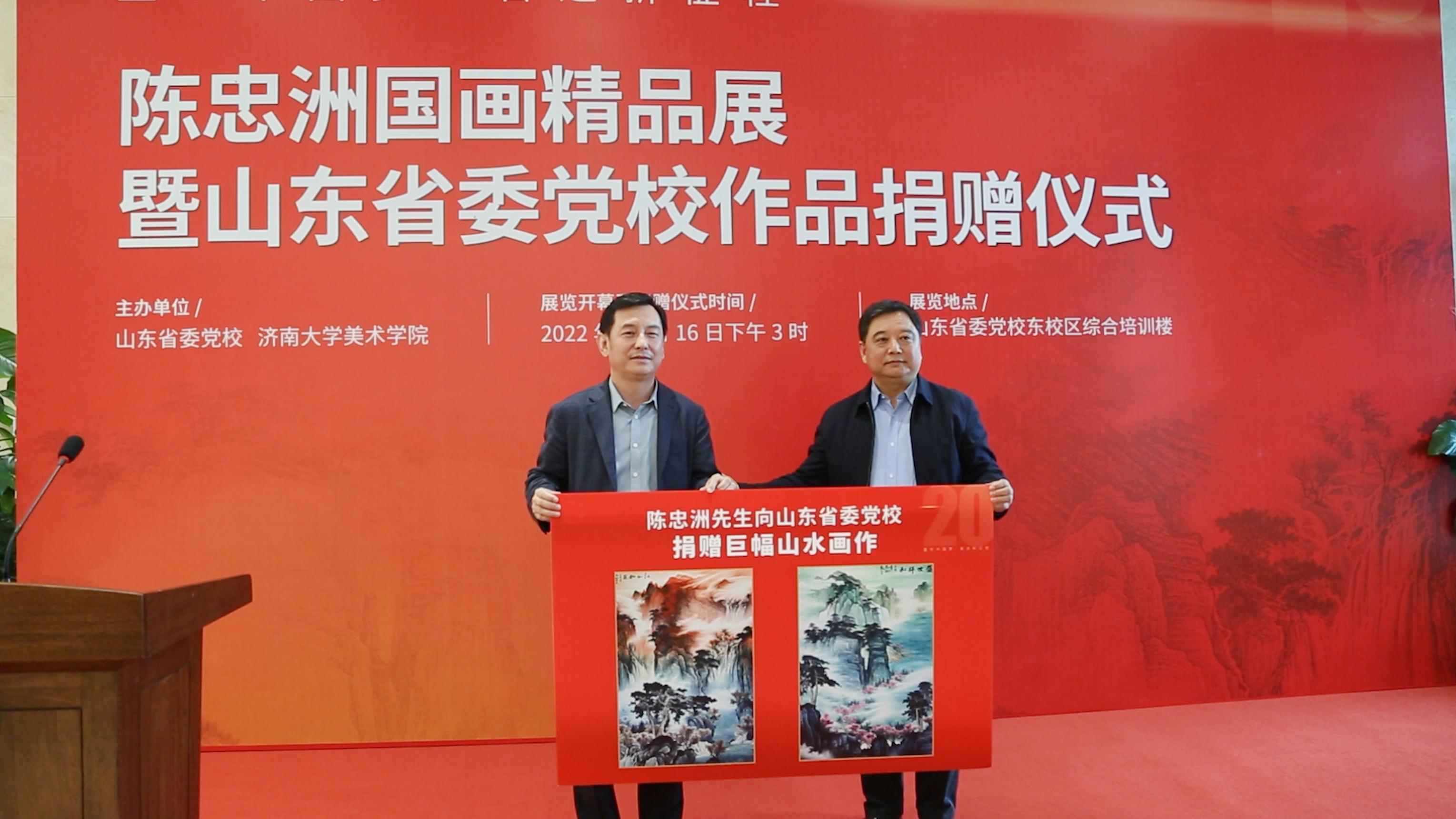 10月16日,陈忠洲国画精品展在山东省委党校开幕,此次画展主题为“盛世中国梦·奋进新征程”。展览现场,陈忠洲向山东省委党校捐赠了两个巨幅书画作品,省委党校(山东行政学院)常务副校(院)长徐闻向陈忠洲颁发了捐赠证书。
