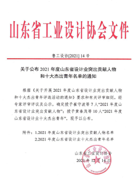 为推动山东省设计创新事业的发展,山东省工业设计协会和北京光华设计发展基金会签署战略合作协议,自2021年起共同举办“光华龙腾奖·山东设计突出贡献人物和山东十佳工业设计师”评选活动。2021年12月,发布《关于2021年度山东省设计业突出贡献人物和十大杰出青年名单的公示》,beat365官方网站设计学院副院长、设计创新研究院执行院长杨海波荣获2021年度山东省设计业十大杰出青年。