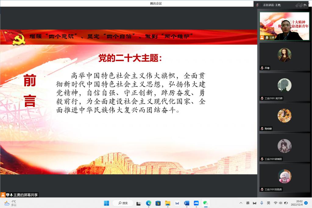 会上,王勇以《做新时代奋进新青年》为题做了主题教育,深刻阐述了党的二十大的重大意义,简要介绍了党的二十大报告的形成过程,深刻阐述过去5年的工作和新时代10年的伟大变革,对准确把握党的二十大报告的主要内容和精神实质进行了系统解读。王勇从党史教育、社会主义建设取得的伟大成就、当代青年大学生应有的担当等几个方面进行了生动的阐述,通过几个真实故事教育我们青年党员要守初心、担使命,争做模范先锋。王书记的宣讲深入浅出,内涵丰富,逻辑严谨,思想深刻,对我们深刻理解和准确把握党的二十大精神有极大的启发。