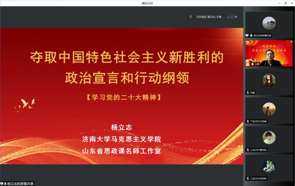 为深入学习贯彻党的二十大精神,领会二十大精神内涵,将二十大精神内化于心。11月29日下午,设计学院党委邀请学校“百人宣讲团”成员、山东高校思政课教学名师工作室主持人、马克思主义学院副院长杨立志教授为全院师生作了题为《夺取中国特色社会主义新胜利的政治宣言和行动纲领》的专题报告。