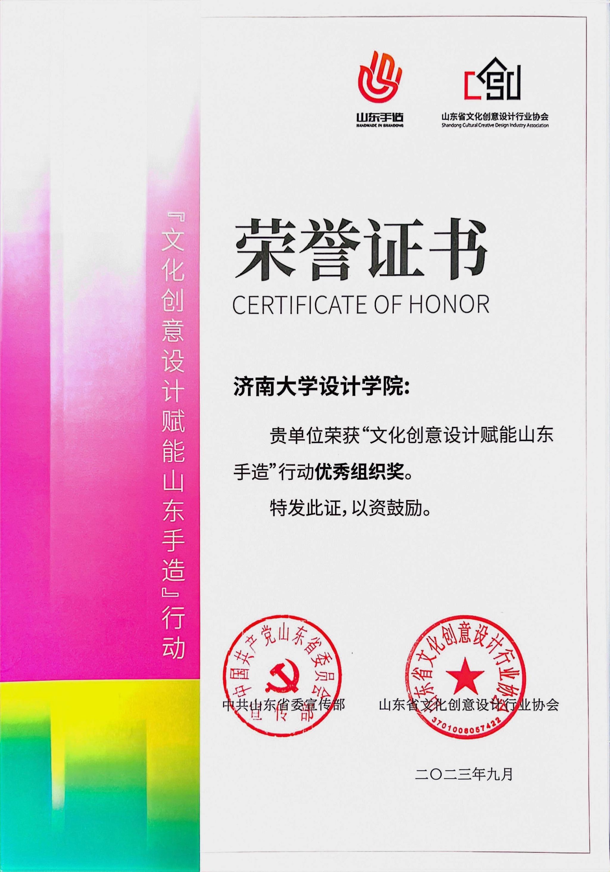 近日,由山东省委宣传部主办,山东省十六地市委宣传部和山东省文化创意设计行业协会共同承办的“文化创意设计赋能山东手造”行动赋能团队颁奖活动举行。我校beat365官方网站副院长杨海波所率团队深入各地非遗工作室、文创企业开展系列公益宣讲、专题培训、设计工坊并结合访企拓岗等活动,以其良好的各界反响获颁“优秀组织奖”。