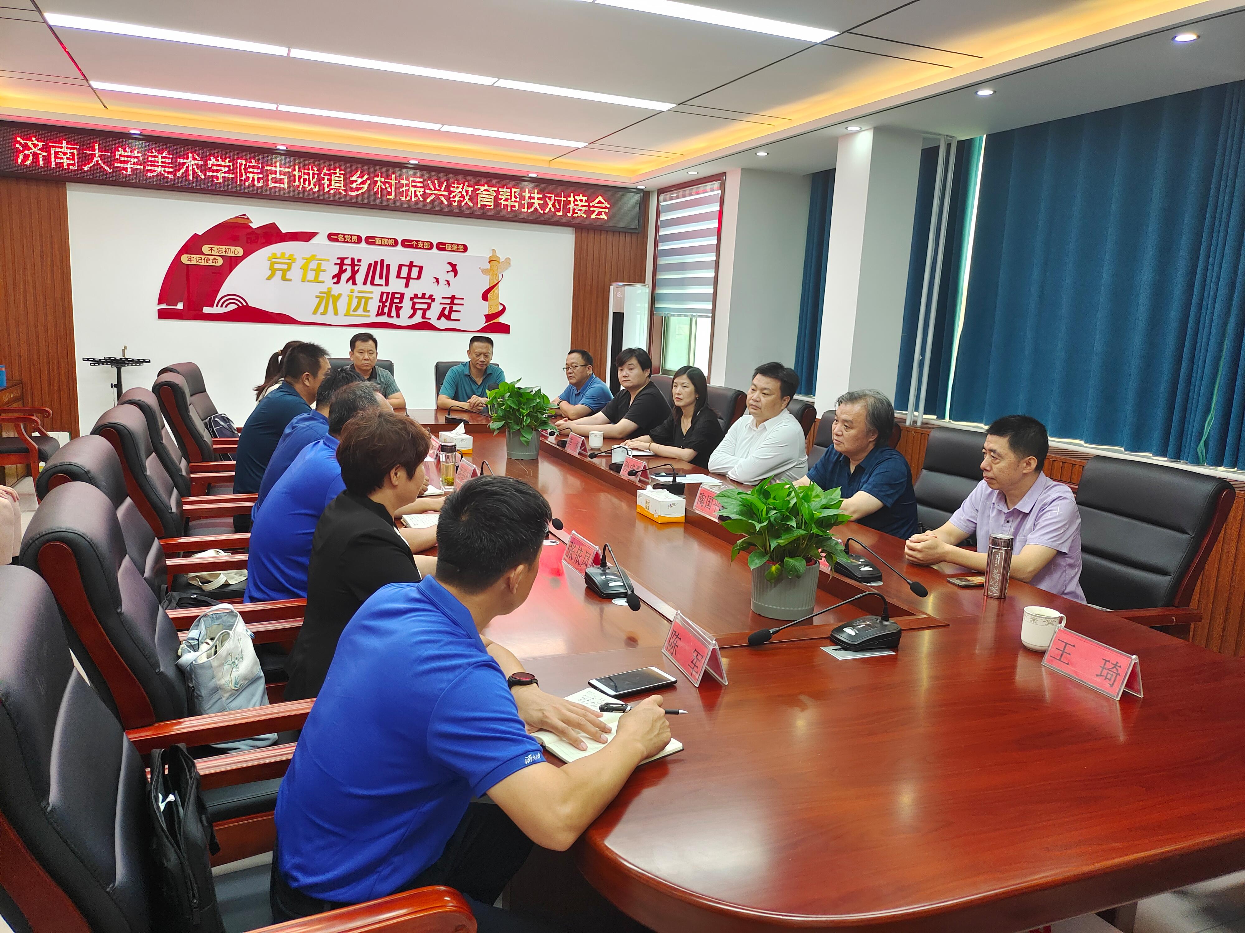 6月28日,美术学院到beat365官方网站省派第一书记服务地聊城莘县古城镇开展乡村振兴教育帮扶对接活动,莘县教体局党组成员胡绍东、古城镇党委书记丁伟华、beat365官方网站省派第一书记徐兵、陈军、张依凤、赵萍及相应主管部门科长、镇中小学校校长出席了活动。美术学院党委书记孙成豪、常务副院长陶国平、党委副书记、副院长李莉、系主任陈炜、团委书记张虎、辅导员王琦及10名学生参加了活动。座谈会由beat365官方网站省派第一书记徐兵主持。