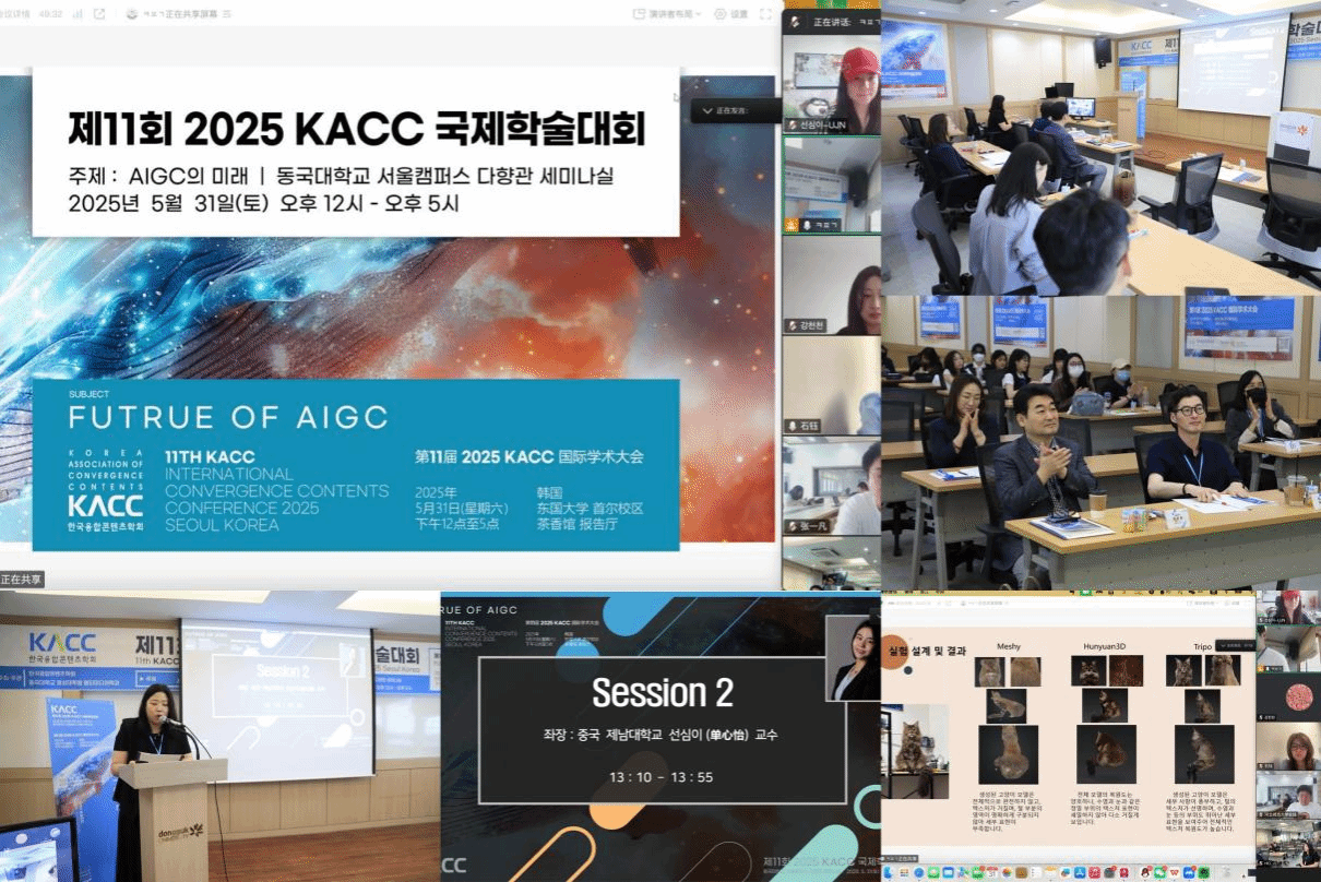2025年5月31日,第11届KACC国际学术大会在韩国首尔召开。本届大会以“AIGC的未来”(Future of AIGC)为主题,聚焦全球人工智能生成内容的技术演进与跨学科应用,围绕AIGC技术现状、伦理挑战及设计应用场景展开深度研讨。beat365官方网站青年教师单心怡参加并主持专题研讨会议。
