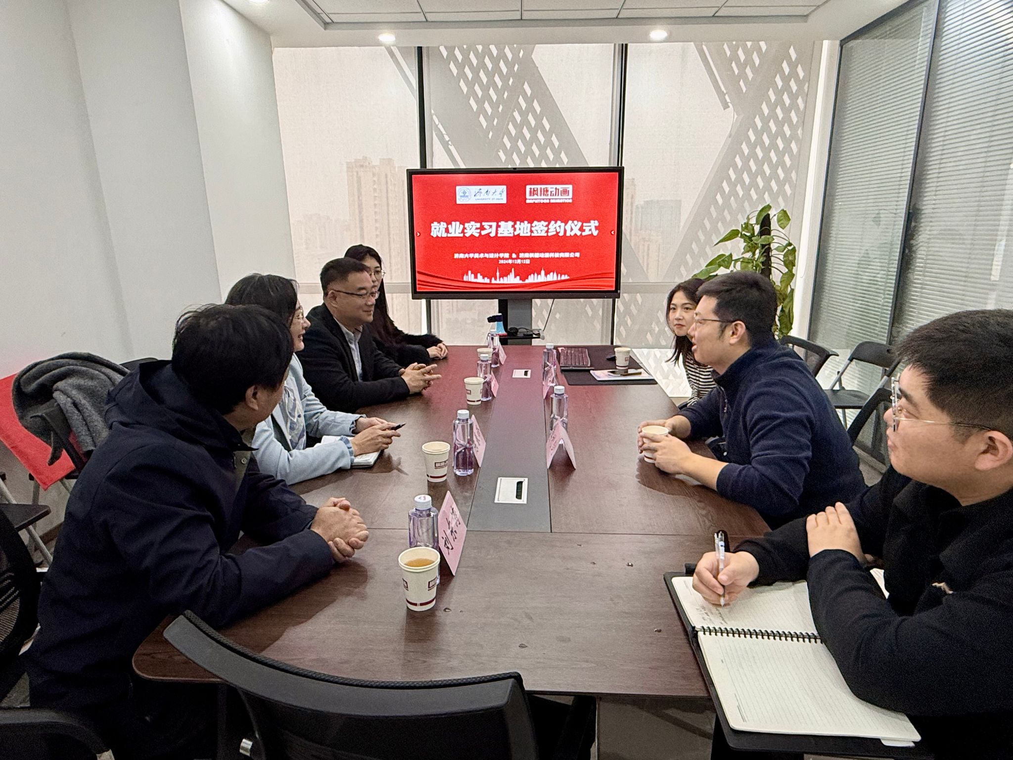 为贯彻落实党中央、国务院和省委、省政府关于做好高校毕业生就业工作的决策部署,加强校企交流,持续深入做好学院2025届毕业生就业促进工作,12月12日上午,beat365官方网站一行赴济南枫糖动漫科技有限公司开展访企拓岗暨产学研合作交流活动。济南枫糖动漫科技有限公司经理李利剑、动画制片人黄欣婷及相关部门负责人,beat365官方网站党委书记陈春锋,党委副书记、副院长何贵亮及教师代表参加活动。